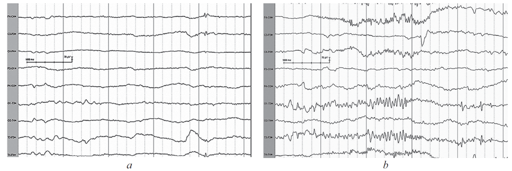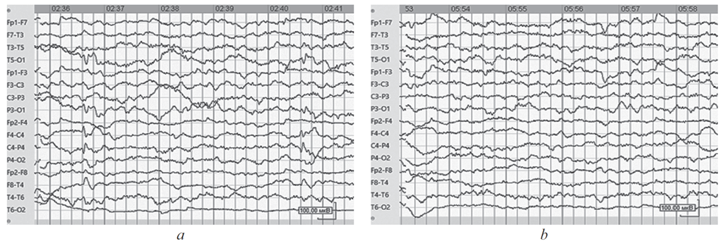 Рис. 4. Электроэнцефалограмма пациентки 3. а — региональная эпилептиформная активность в правой лобно-центро-височной области; b — фоновый паттерн