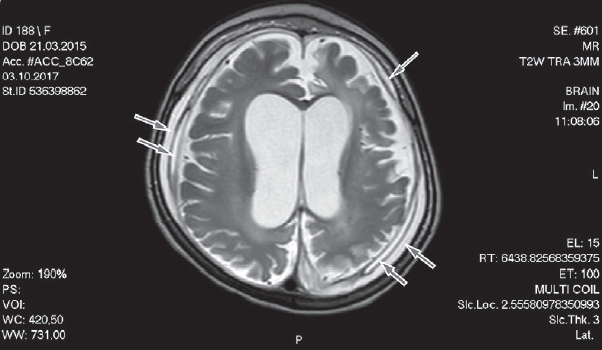 Пациентка 2 (девочка, 2 года 7 месяцев) поступила в микрохирургическое отделение СПбГПМУ с жалобами на значительное отставание в психомоторном развитии и эпилептические приступы. Из анамнеза известно, что беременность протекала на фоне хронической урогенитальной инфекции. Роды вторые срочные, путем операции кесарева сечения на фоне вторичной родовой слабости, начавшейся интранатальной асфиксии плода. Вес при рождении 3200 г. С рождения мама отмечает задержку психомоторного развития. В возрасте 2 месяцев отмечен первый судорожный приступ, на фоне повышенной температуры тела, обструктивного бронхита с дыхательной недостаточностью 2–3-й степени, сердечно-сосудистой недостаточностью 1–2-й степени. Девочка госпитализирована в реанимационное отделение Российской детской клинической больницы. Отмечались повторные афебрильные судорожные приступы. Ребенок наблюдался у инфекциониста в связи с генерализованной формой врожденной миксгерпетической вирусной инфекцией (I, IV, V типов), хроническое течение (гепатит, энцефалопатия, лимфаденопатия, спленомегалия); вторичной иммунной недостаточностью. При поступлении в клинику СПбГПМУ у ребенка сохранялись судорожные приступы в виде эпизодов тонического напряжения конечностей с отведением глазных яблок кверху, ежедневно. Получала антиэпилептическую терапию (Леветирацетам по 40 мг/кг в сутки). Пациентке проведена МРТ головного мозга: МР-признаки двусторонних хронических субдуральных гематом. Глиозно-атрофические изменения белого вещества обеих гемисфер головного мозга, больше справа. Смешанная заместительная гидроцефалия. Mega cisterna magma. Микроцефалия. Данные МРТ представлены на рис. 3. По результатам комплексного мультимодального обследования установлен диагноз: «Органическое поражение центральной нервной системы. Хронические двухсторонние субдуральные гематомы. Атрофические изменения белого и серого вещества обеих гемисфер головного мозга. Смешанная заместительная гидроцефалия. Аномалия Денди – Уокера. Грубое отставание в психомоторном и речевом развитии. Спастический тетрапарез. Псевдобульбарный синдром. Структурная фокальная эпилепсия. Частичная атрофия зрительных нервов обоих глаз. Умеренная спленомегалия». В клинической больнице СПбГПМУ выполнено оперативное вмешательство: костно-пластическая краниотомия, проведено удаление хронических многоуровневых субдуральных гематом справа. По данным послеоперационной мультиспиральной компьютерной томографии, сохранялась заместительная гидроцефалия на фоне атрофических изменений головного мозга. В сравнении с предоперационным исследованием отмечалось уменьшение объема субдуральной гематомы справа. В послеоперационном периоде судороги купированы. Проведен контроль ЭЭГ в послеоперационном периоде: регистрировался уплощенный фоновый паттерн, замедление возрастного ритма. Регистрировались единичная вспышка региональной эпилептиформной активности, высокоамплитудные деформированные комплексы «острая волна — медленная волна» в передних областях правого полушария. Пациентка с улучшением неврологического состояния, купированием эпилептических приступов (клинико-энцефалографическое улучшение на фоне продолжения антиэпилептической терапии Леветирацетамом в дозе 40 мг/кг в сутки) выписана на амбулаторное л