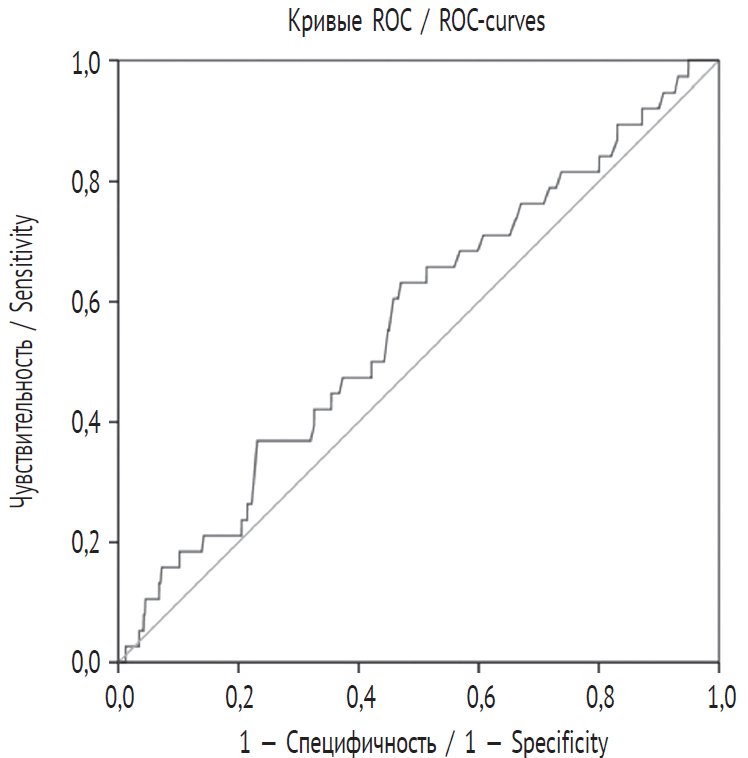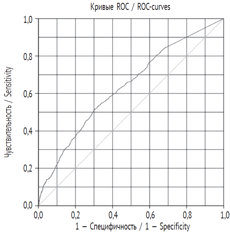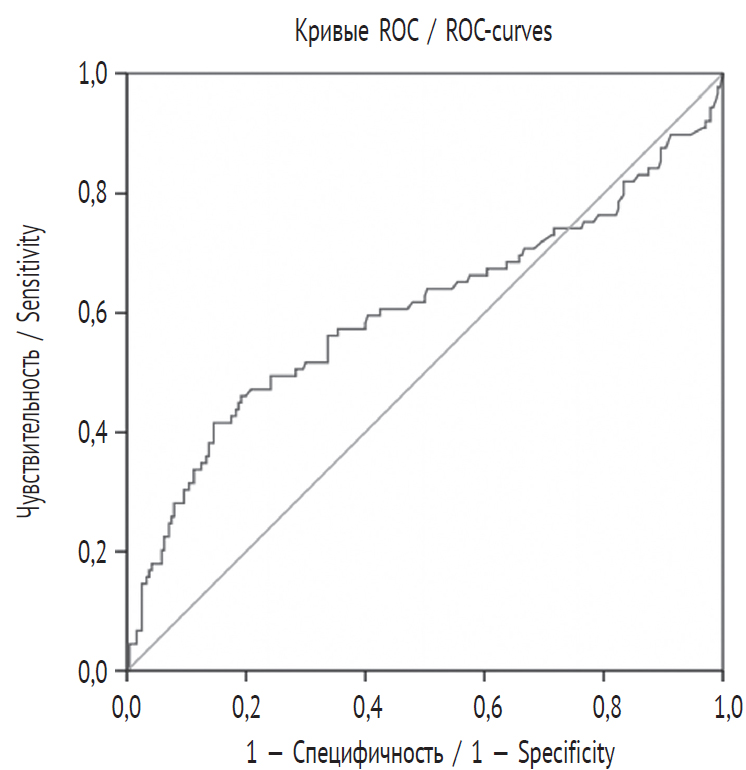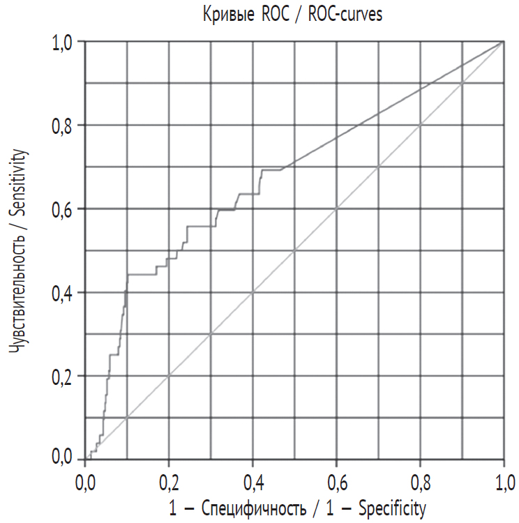 Статистический анализ полученных данных осуществляли с использованием программы Statistica 7 (Statsoft Inc., США). Для определения статистической значимости различий между количественными параметрами использовали критерий Манна – Уитни для независимых групп. Статистическую обработку качественных признаков проводили с использованием следующих критериев: Фишера, χ2, χ2 с поправкой Йейтса, расчета отношения шансов (OR). Критерием статистической значимости считалась общепринятая в медицинской статистике величина p < 0,05. Качество разрабатываемых в настоящем исследовании бинарных классификаций оценивалось при помощи ROC-кривой. Для количественной оценки ROC-кривой применяли показатель «площадь под ROC-кривой». Чем выше данный показатель, тем выше качество классификации: 0,7–0,8 — хорошее, 0,8–0,9 — очень хорошее, 0,9–1,0 — отличное. При значении показателя 0,5 метод классификации соответствует случайному распределению.