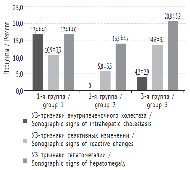 В структуре УЗ-изменений органа выявлены умеренная гепатомегалия, реактивные изменения (в виде повышения зернистости стромы), признаки внутрипеченочного холестаза (в виде подчеркнутости стенок желчных протоков). У детей 1-й группы чаще визуализировались признаки внутрипеченочного холестаза (17,4 ± 4,0 %), чем у детей 3-й группы (4,2 ± 2,9 %, р < 0,05), и которые не наблюдались у детей 2-й группы (рис. 1).