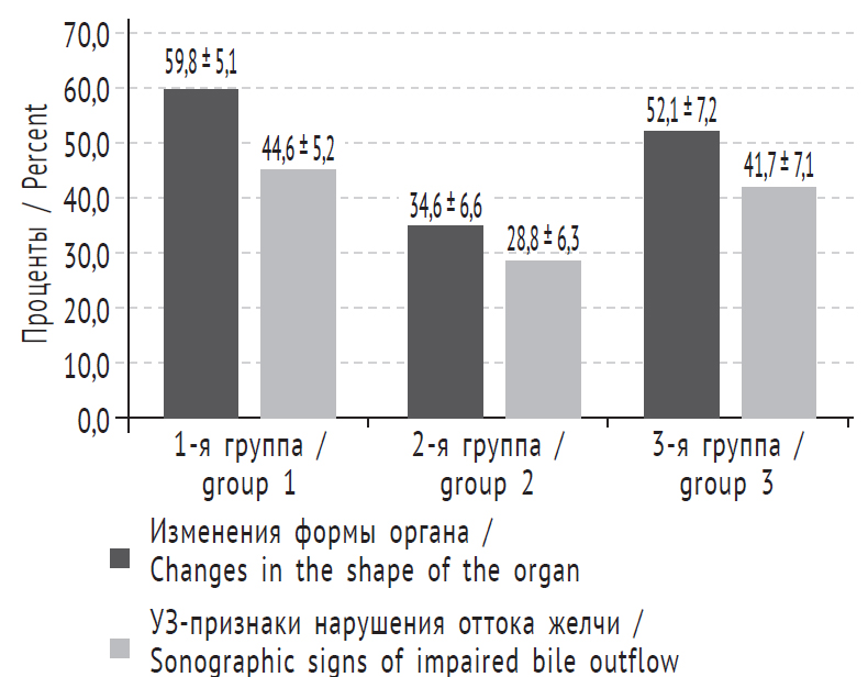 Не было выявлено достоверной разницы в частоте визуализации нарушений оттока желчи у детей сравниваемых групп. У части пациентов всех групп (30,4 ± 4,8, 13,5 ± 4,7 и 33,3 ± 6,8 % случаев в 1, 2 и 3-й группах соответственно) отмечалось сочетание признаков УЗ-изменений.