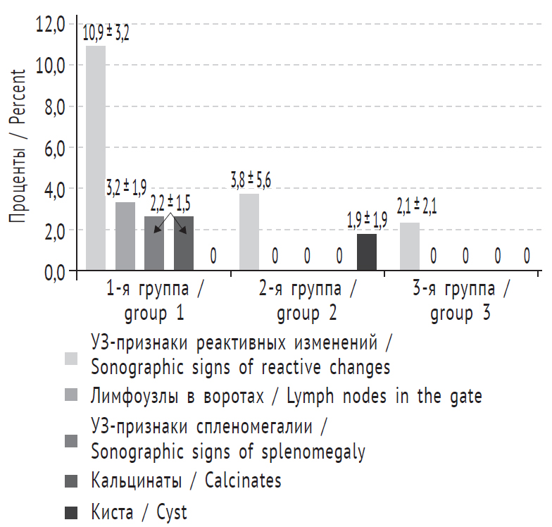 Как показано на рис. 3, в структуре выявленных изменений преобладали реактивные (в виде повышения зернистости стромы), которые у детей 1-й группы наблюдались чаще (10,9 ± 3,2 %), чем у детей 2-й и 3-й групп (3,8 ± 5,6 и 2,1 ± 2,1 % случаев соответственно, р < 0,05). У двух детей 1-й группы (2,2 ± 1,5 %) были выявлены кальцинаты в строме органа (единичные или множественные в виде гиперэхогенных очагов с акустической тенью), которые трактовались как специфические обызвествленные очаги.