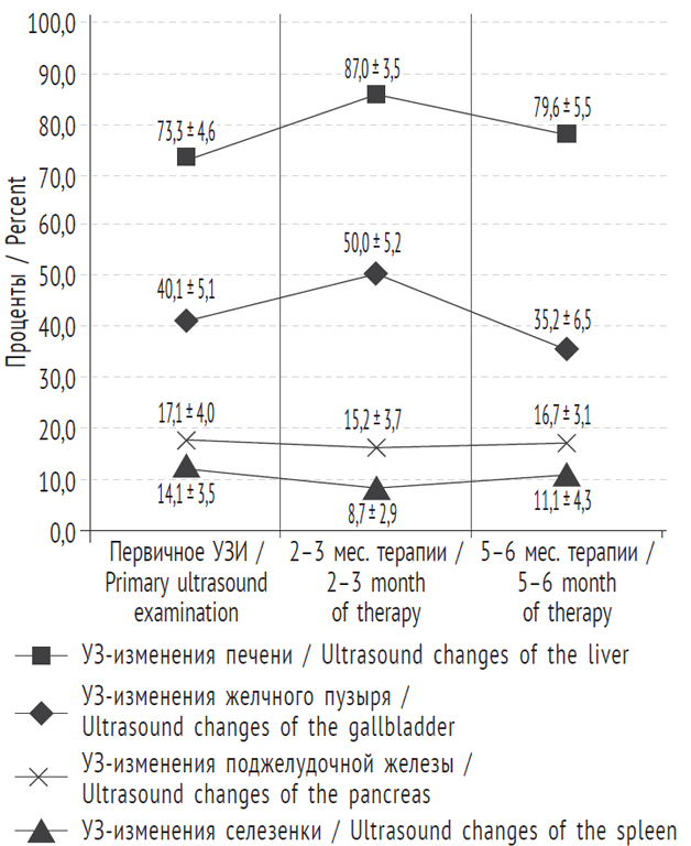 Fig. 4. Dynamics of detection of sonographic changes in abdominal organs in children with active tuberculosis during specific therapy