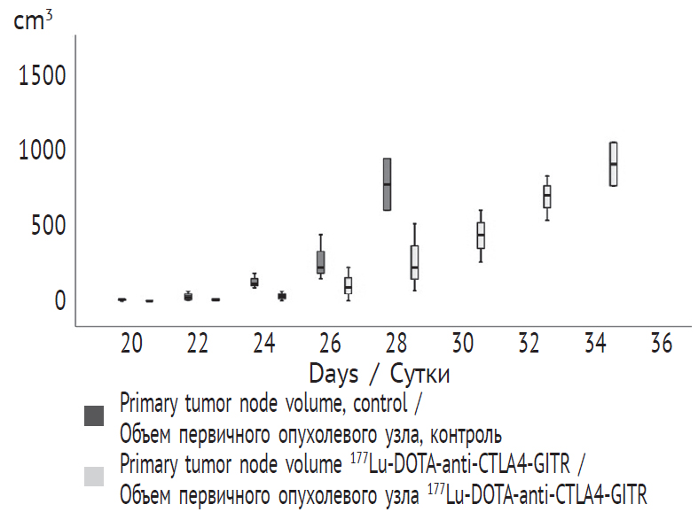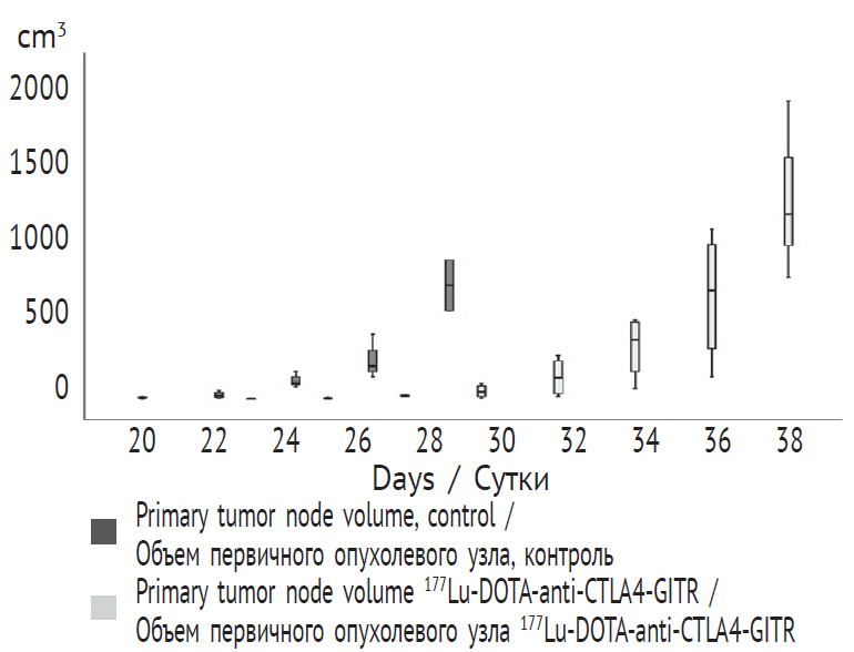 Inhibition of the latent period of neoplasm development with the use of the test drug contributed significantly to a later and slower increase of the tumor node. The inhibition of tumor growth was more pronounced during the course application of 177Lu-DOTA-anti-CTLA4-GITR compared to its single administration to experimental animals.
