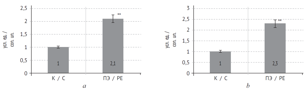 Рис. 3. Уровень содержания эндоглина-1 (a) и sFLT-1 (b) в плаценте обследованных групп пациенток. К — группа контроля, физиологическая беременность; ПЭ — основная группа, преэклампсия. ** Достоверные различия между группой К и ПЭ, р < 0,001