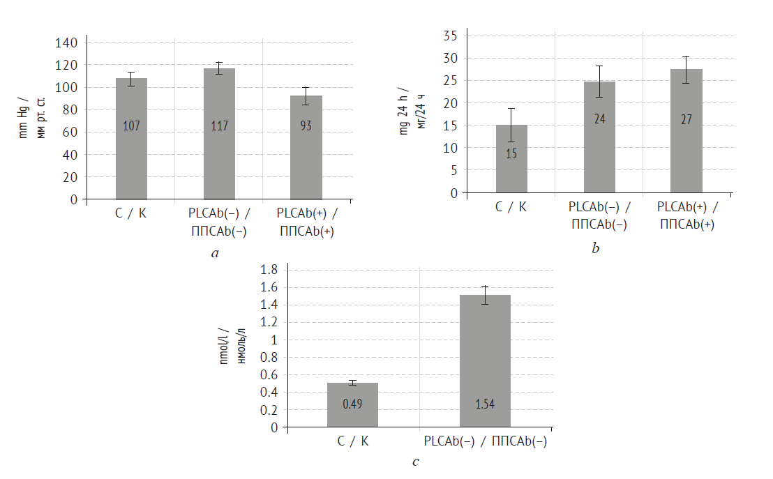 Рис. 1. Уровень систолического артериального давления (а), суточной протеинурии (b) и МБГ в плазме крови (c) в экспериментальных группах. К — группа крыс с обычной диетой (первая, контроль); ППСAb(–) — группа крыс с преэклампсия-подобным состоянием (вторая), которым не вводили антитела к МБГ; ППСAb(+) — группа крыс с преэклампсия-подобным состоянием, которым вводили антитела к МБГ (третья)