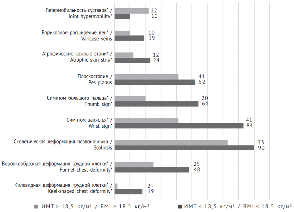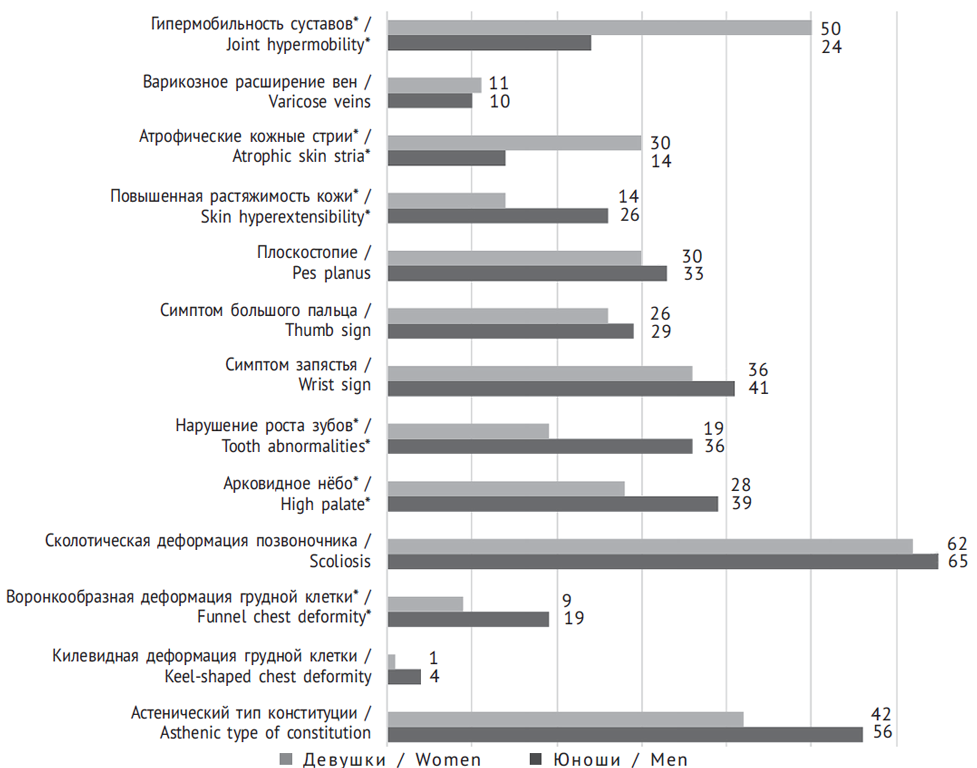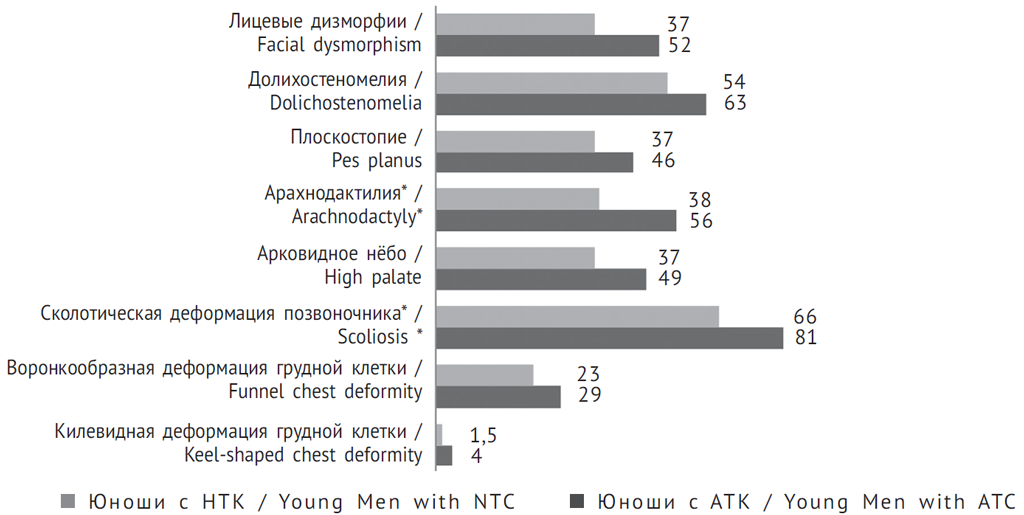 Таким образом, полученные данные обусловливают необходимость разработки алгоритмов диагностики диспластических фенотипов у молодых людей с учетом пола обследуемых. Наиболее специфичные костные признаки, входящие в алгоритм диагностики ряда диспластических фенотипов, характеризующихся вовлечением костной системы в диспластический процесс (марфаноидная внешность, марфаноподобный фенотип) — деформации грудной клетки, арахнодактилия, долихостеномелия и высокое арковидное нёбо, существенно чаще выявляются у юношей. При обследовании пациентов с низкой массой тела целесообразно выполнение фенотипического обследования для исключения диспластических фенотипов, характеризующихся вовлечением костной системы.
