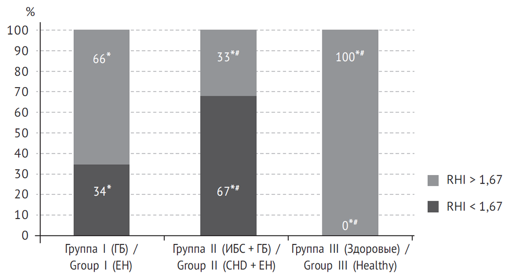 Из полученных данных следует, что в отличие от пациентов с изолированной ГБ, при сочетании ГБ с перенесенным инфарктом миокарда дисфункция эндотелия наблюдается в бóльшем проценте случаев, а степень выраженности эндотелиальных нарушений по значению индекса RHI — выше.