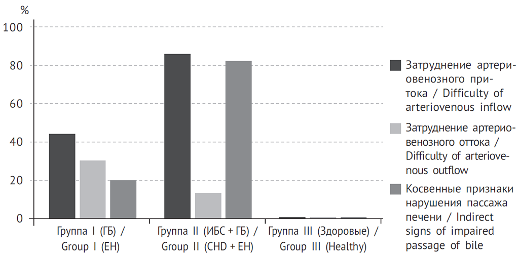 - У большинства исследованных больных ГБ и ИБС выявлено нарушение внутрипеченочной микроциркуляции. При сочетании ИБС с ГБ внутрипеченочная гемодинамика в 85 % случаев характеризуется нарушением артериовенозного притока, в то время как в группе пациентов с изолированной ГБ характер нарушений портопеченочной гемодинамики был разнонаправленный и в 43 % случаев характеризовался нарушением артериовенозного притока, а в 31 % — нарушением венозного оттока из печени.
