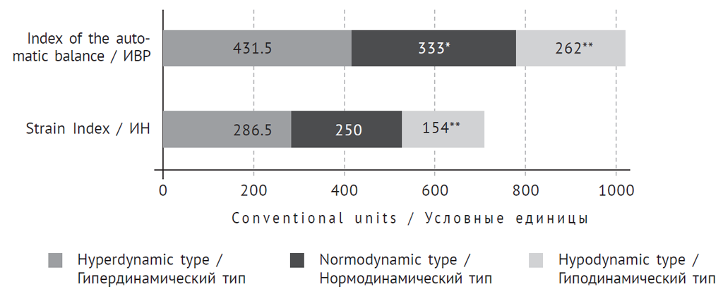 Fig. 2. Indicators of the autonomic balance and strain index in patients with acute cerebrovascular accidents and different types of haemodynamics in the first days after vascular catastrophe. * – reliably when comparing indicators of the groups of hyperdynamic and normodynamic types of blood circulation, р < 0.05; ** – reliably when comparing indicators of the groups of hyperdynamic and hypodynamic types of blood circulation, р < 0.05