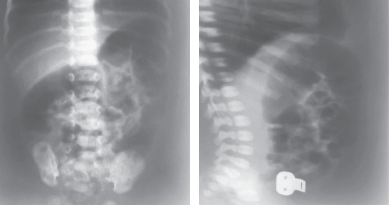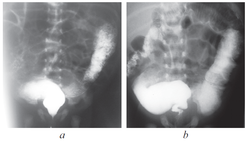 Fig. 8. Contrast enema. а – second day of life; b – two weeks of life