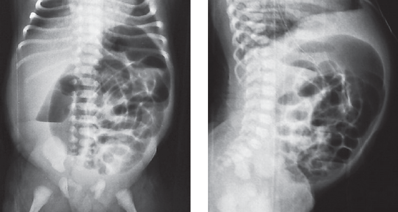 Доношенный полновесный ребенок поступил на 5-е сут жизни в стационар с жалобами на вздутие живота, срыгивания с примесью желчи и отсутствие стула. На обзорной рентгенограмме брюшной полости выявлено равномерное распределение газа по кишечнику без уровней жидкости и раздутая на всем протяжении газом толстая кишка (рис. 1, 2).