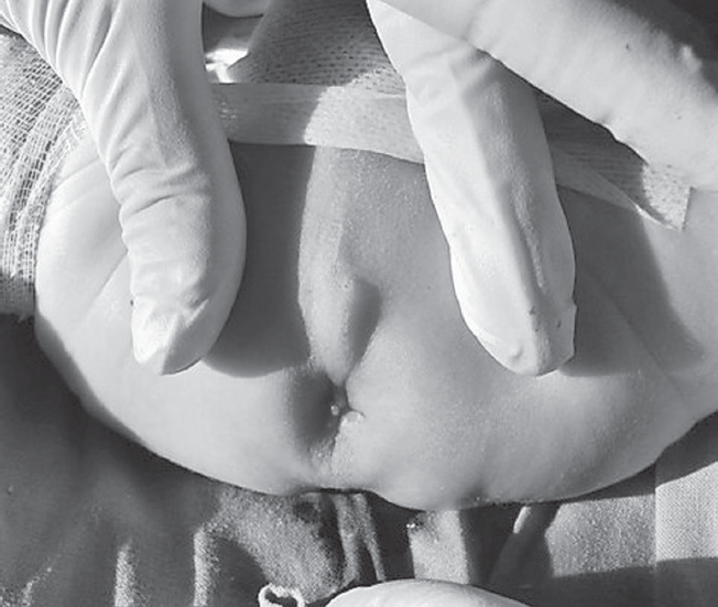Ярким примером невнимательного отношения к осмотру промежности служит случай 2 новорожденного ребенка со стенозом ануса и прямой кишки. При первичном обследовании пациента с подозрением на врожденную кишечную непроходимость можно получить много ценной информации и составить дальнейший план обследования. Задачей хирурга является не только выявление симптомов кишечной непроходимости, но и оценка правильности формирования промежности. Необходимо исключить различные варианты аноректальных аномалий — от атрезии ануса и прямой кишки с наружными свищами до стеноза ануса и прямой кишки. Признаком возможного стеноза прямой кишки может служить форма анального отверстия, располагающегося в глубине кожной воронки (рис. 7). В этом случае необходимо выполнить калибровку анального канала, который должен беспрепятственно пропускать буж № 10.