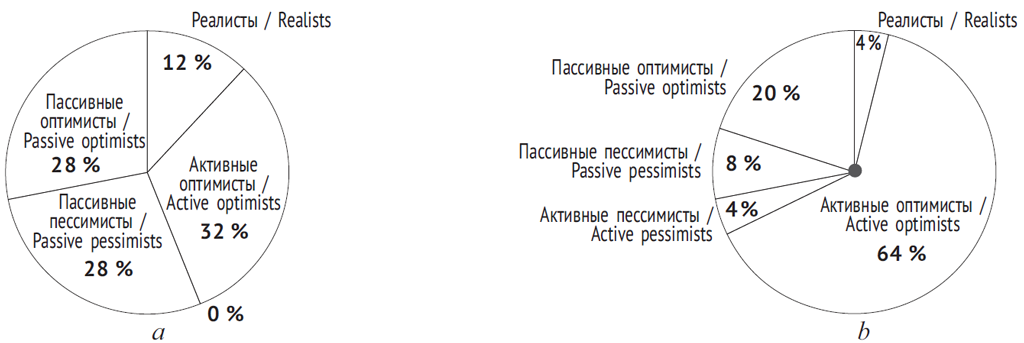 Педагоги общеобразовательной школы отличаются более выраженным оптимизмом, который во многом определяет хорошую стрессоустойчивость личности (p ≤ 0,05). Для них характерны личностные типы с наибольшим адаптационным потенциалом: «реалисты» и «активные оптимисты», для которых свойственны вера в свои силы, позитивный настрой на будущее, активные действия для достижения желаемых целей, меньшая подверженность унынию, быстрая и эффективная реакция на различные стрессовые факторы.