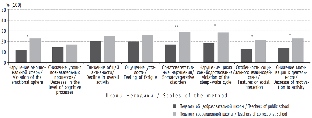 Fig. 4. Features of psychological and physiological professional maladjustment of teachers. Statistical significance: * p ≤ 0.05, ** p ≤ 0.01