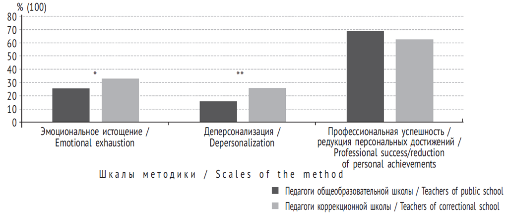 Рис. 5. Особенности профессионального «выгорания». Уровни статистической значимости: * p ≤ 0,05, ** p ≤ 0,01
