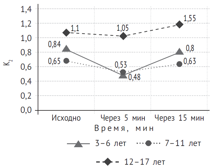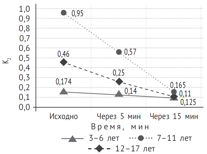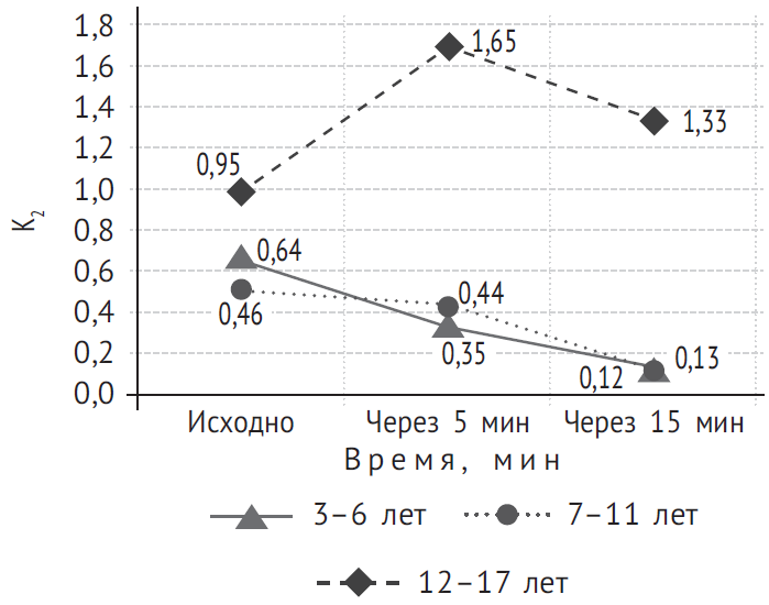 При среднетяжелой бронхиальной астме через 5 мин после воздействия аппарата «Астер» у детей 3–6 и 7–11 лет отмечалось незначимое нарастание акустической работы дыхания на уровне бронхов среднего и мелкого калибра. К 15-й минуте существенный регресс вентиляционных нарушений замечен у пациентов 7–11 лет (в 3,5 раза, р < 0,05), тенденция к снижению К2 среди пациентов 12–17 лет, в сравнении с лицами дошкольного возраста, демонстрирующими некоторое снижение показателей бронхиальной проходимости по сравнению с исходным уровнем (рис. 2).