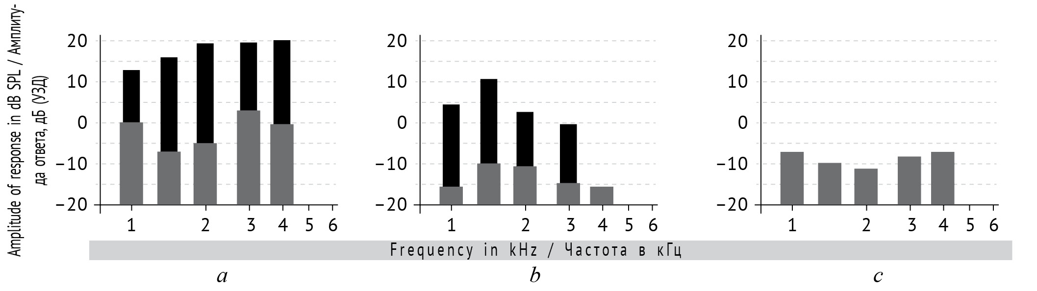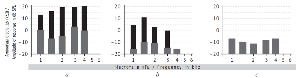 Рис. 1. Пример регистрации задержанной вызванной отоакусической эмиссии: а — у новорожденного; b — у взрослого; c — отсутствие. Серые столбцы — фоновый шум; черные — задержанная вызванная отоакусическая эмиссия