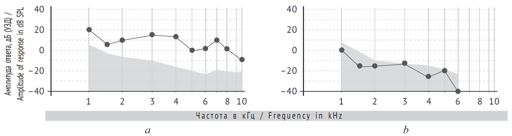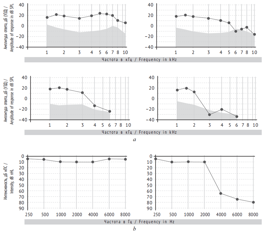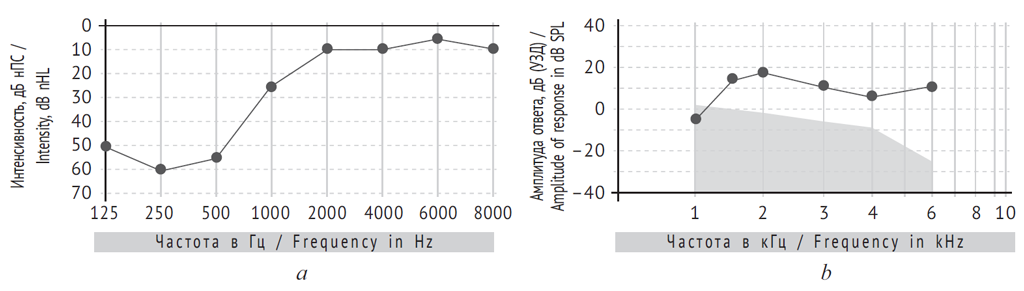 Рис. 3. Низкочастотная тугоухость у ребенка 3 лет: а — тональная пороговая аудиограмма; b — регистрация отоакустической эмиссии на частоте продукта искажения. Серым цветом отмечен фоновый шум; сплошной линией — отоакустическая эмиссия на частоте продукта искажения