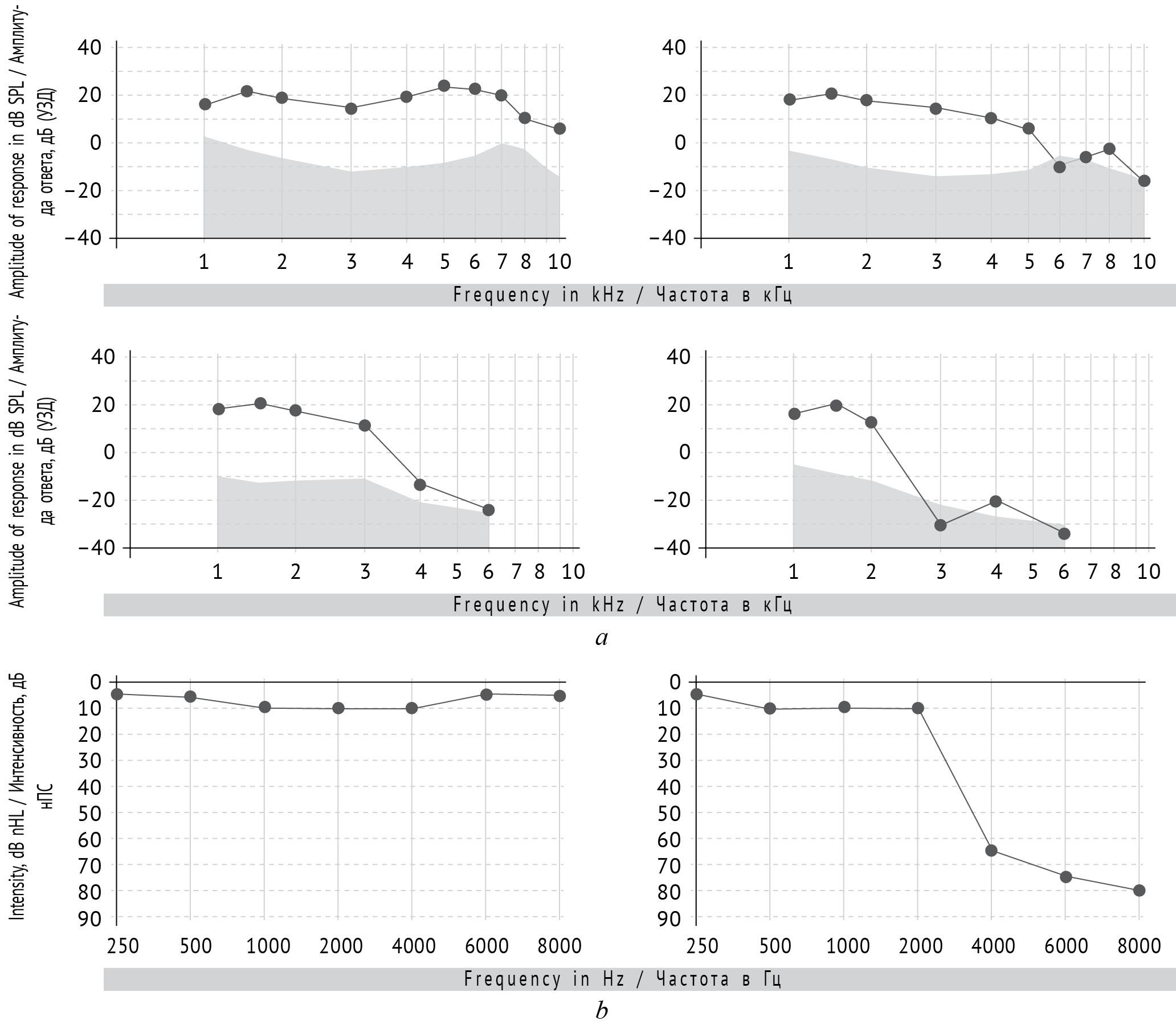 Характер начальных проявлений ототоксичности требует применения методов диагностики, оценивающих высокочастотный диапазон. Основными методами являются проведение тональной пороговой аудиометрии в расширенном диапазоне частот и регистрация ОАЭ. У детей раннего возраста, а также у пациентов, находящихся в тяжелом состоянии, проведение тональной пороговой аудиометрии затруднительно, и ОАЭ становится основным методом мониторинга ототоксичности. Для данной цели используется регистрация ОАЭПИ с возможностью записи до 10–12 кГц. На рис. 4 представлены избранные результаты аудиологического тестирования ребенка с медуллобластомой, получавшего полихимиотерапию с применением цисплатина.