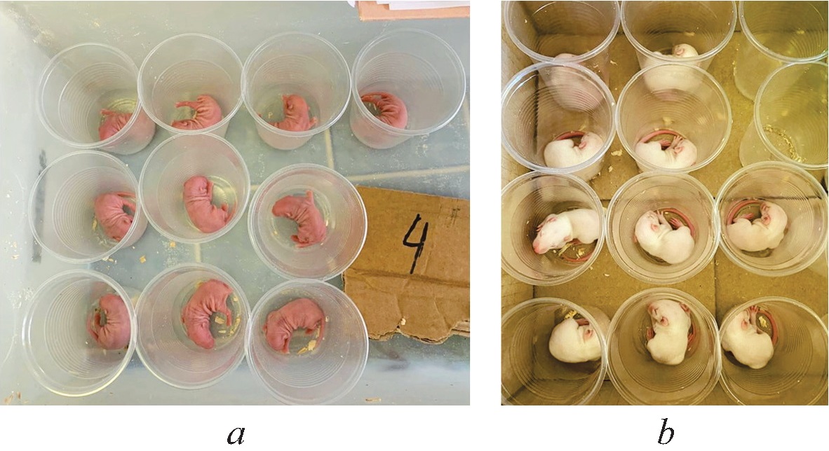 Fig. 1. 3-hour deprivation session: а — baby rats in individual plastic cups on the 3rd postnatal day; b — baby rats in individual plastic cups on the 10th postnatal day