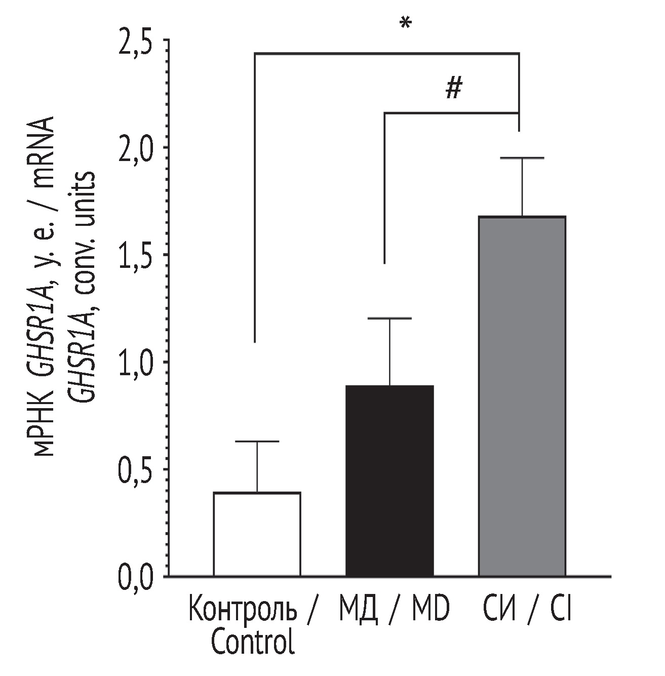 Fig. 2. The level of GHSR1A mRNA in the hypothalamus of the rat brain. *p < 0.05 in relation to the control group; #p < 0.05 in relation to the maternal deprivation group. Control — a group of intact animals; MD — a group of weaning from the mother; CI — a group of social isolation