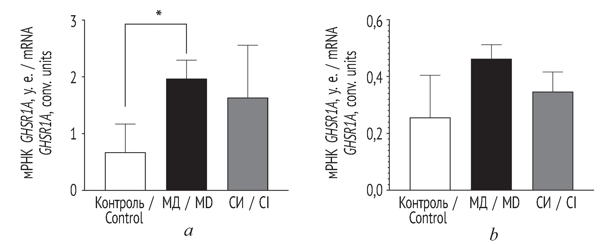 Fig. 3. The level of GHSR1A mRNA in the amygdala (а) and prefrontal cortex (b) of the rat brain. *p < 0.05 relative to the control group. Control — a group of intact animals; MD — a group of weaning from the mother; CI — a group of social isolation