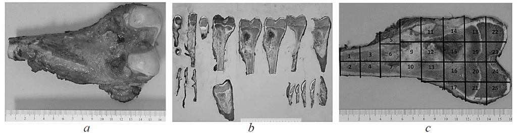 Рис. 1. Цифровые фотографии макропрепарата сегментарной резекции левого бедра по поводу остеосаркомы: a — общий вид интактного макропрепарата; b — серийные распилы макропрепарата; с — карта-схема центральной костной пластины