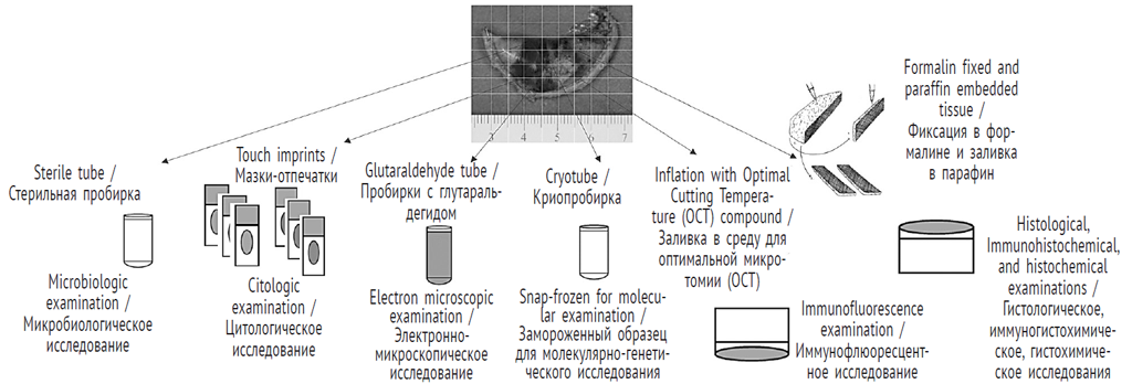 If the investigated specimen has papillary structures or consists of cysts, photographs should be taken with the specimen in a saline solution. If a formalin-fixed specimen has been submitted for study, some authors recommend putting the sample in a container with absolute ethyl alcohol for 2 h to restore the original color. However, this issue remains controversial [15].