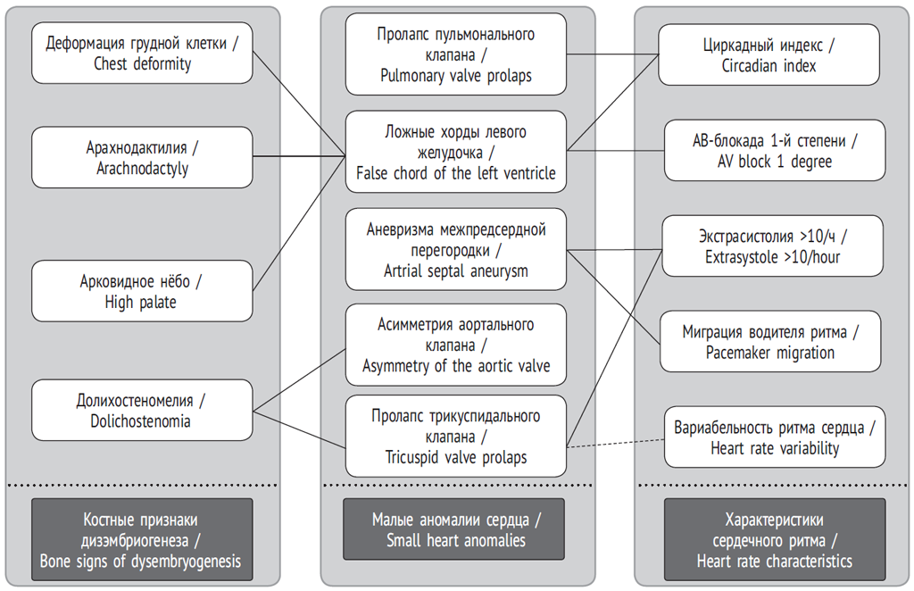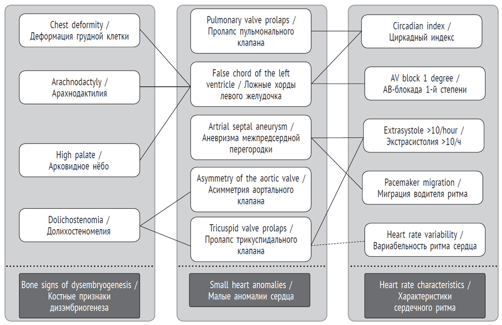 In 36% of essentially healthy individuals, at least three SHA were identified. When using a quantitative approach, they created the prerequisites for overdiagnosing connective tissue dysplasia syndrome of the heart. In addition, it seems that it is not very promising to consider all SHA in the same breath without considering their specificity and connection with other manifestations of hereditary connective tissue disorders. In this regard, a correlation analysis of SHA with bone signs of dysembryogenesis, characterizing the skeletal system involvement in the dysplastic process, and features of heart rhythm and conduction was performed (Fig. 1). Bone signs are closely related to such SHA as significant LVPC (multiple, median, mid-basal, and basal localization), aortic valve asymmetry, and tricuspid valve prolapse. On the other hand, SHAs are associated with cardiac arrhythmias – supraventricular and ventricular extrasystoles in large numbers (more than 10 per hour), episodes of pacemaker migration through the atria, and AV block 1 degree. It also revealed a relationship between SHA with an increase in the circadian index (the ratio of the average daily and average night heart rate) and a decrease in heart rate variability (feedback).