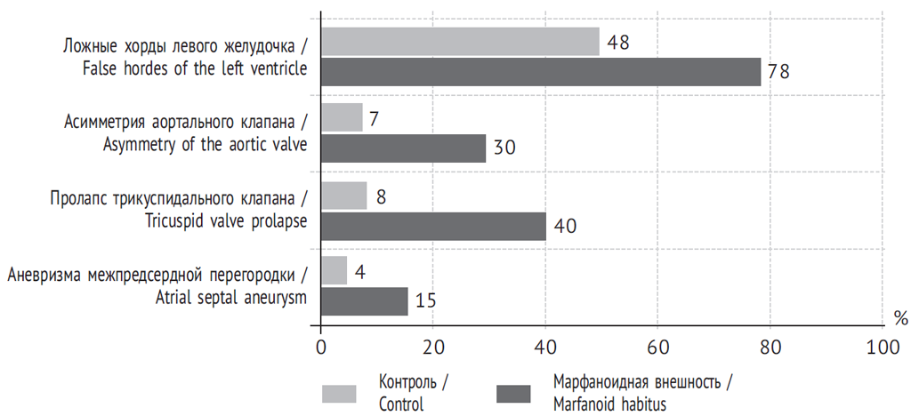 Рис. 2. Распространенность малых аномалий сердца у лиц молодого возраста с марфаноидной внешностью