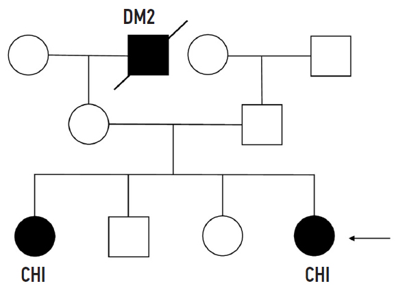 MGT was performed to confirm the diagnosis and determine a personalized treatment approach. In exon 2 of ABCC8 (NM_000352.6), a homozygous single nucleotide substitution was identified, resulting in the substitution of amino acid c.259T>C, p. Cys87Arg. This ABCC8 mutation was detected in her father, mother, and older sister who suffered from organic lesions of the central nervous system (CNS) and persistent hypoglycemia. At the age of 12, the diagnosis of the older sister was confirmed following the acquisition of MGT results from all family members. Genealogical information of the patient is shown in Fig. 1.