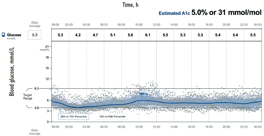 Blood glucose control was performed 24/7 using a flash monitoring system (Fig. 2). The disease was in remission, as confirmed by laboratory examinations, which showed glycated hemoglobin (HbA1c) at 4.7% (normal range, 4.0%–6.0%), insulin level of 2.0 (normal range, 2.0–25.0) µED/mL, and C-peptide level of 2.24 (normal range, 0.50–3.20) ng/mL. Episodes of hypoglycemia infrequently occur during intercurrent illnesses (minimum blood glucose, 2.9 mmol/L).