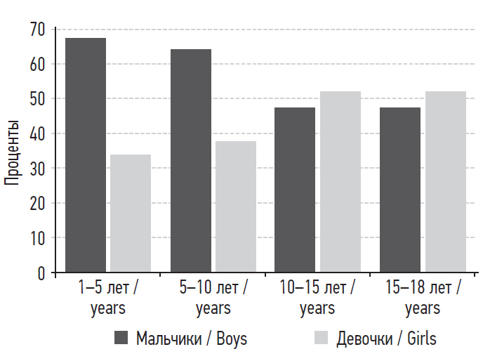 Распределение пациентов по полу было следующим: в первых двух группах мальчики составили более 60 %, соответственно: I — 66,4 % (n = 81), II — 63,4 % (n = 85) по сравнению с девочками этих групп: I — 33,6 % (n = 41) и II — 36,6 % (n = 49); р ≤ 0,05. В старших возрастных группах незначительно преобладали девочки (III — 52,2 %, n = 35, IV — 52,8 %, n = 28) по сравнению с мальчиками (III — 47,8 %, n = 32, IV — 47,2 %, n = 25); р ≤ 0,001 (рис. 1).
