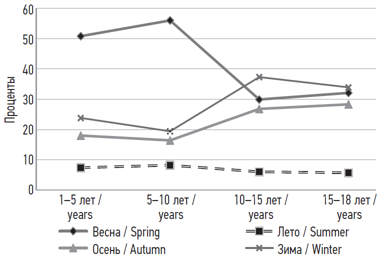 В весенние месяцы чаще госпитализировались дети первых 10 лет жизни (I — 50,8 %, n = 62, II — 56,0 %, n = 75) в сравнении с другими возрастными группами (III — 29,9 %, n = 20, IV — 32,1 %, n = 17); р ≤ 0,05. В зимний сезон года чаще поступали дети старших возрастных групп (III — 37,3 %, n = 25, IV — 33,9 %, n = 18) в сравнении с младшими детьми (I — 23,8 %, n = 29, II — 19,4 %, n = 26); р ≤ 0,05. В осенний сезон среди госпитализированных преобладали пациенты старших возрастных групп (III — 26,8 %, n = 18, IV — 28,3 %, n = 15) по сравнению с младшими (I — 18,0 %, n = 22, II — 16,8 %, n = 22); р ≤ 0,05. Снижение количества госпитализированных отмечалось в летний период года во всех возрастных группах: I — 7,4 % (n = 9), II — 8,2 % (n = 11), III — 6,0 % (n = 4), IV — 5,7 % (n = 3) (рис. 2).