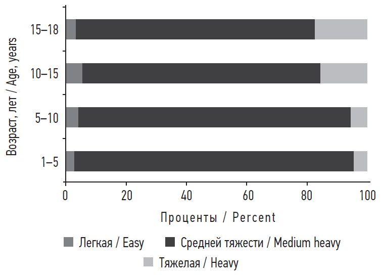 В большинстве случаев заболевание протекало в средней степени тяжести, тяжелая степень регистрировалась в 8,2 % преимущественно у детей старшего возраста, легкая — 2,2 %.