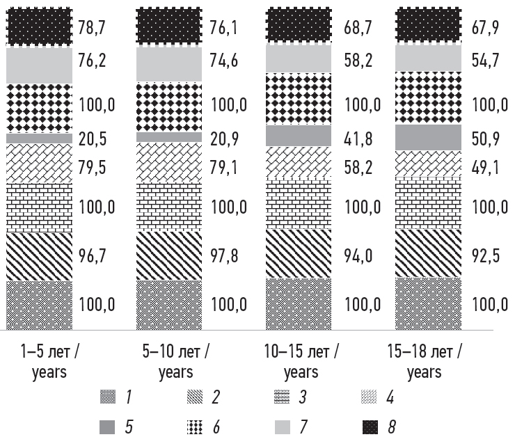 Рис. 4. Клинические симптомы (%) острого ВЭБ-мононуклеоза у госпитализированных детей в различных возрастных группах (n = 376). 1 — интоксикация; 2 — лихорадка; 3 — острый аденоидит; 4 — острый тонзиллит с налетами на нёбных миндалинах; 5 — острый тонзиллит без налетов на нёбных миндалинах; 6 — лимфаденопатия; 7 — гепатомегалия; 8 — спленомегалия