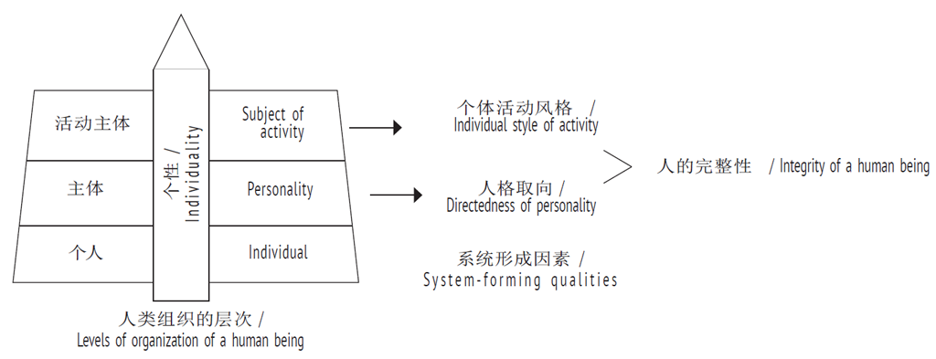 Б.Г. Ананьев, исследуя структуру человека, ввел понятие индивидуальности, характеризующее, по его мнению, глубину личности. Он подчеркивал, что именно в индивидуальности «замыкается внутренний контур регулирования всех свойств человека как индивида, личности <…> и субъекта различных деятельностей» [5]. Указание Б.Г. Ананьева, что «индивидуальность — это „глубина“ личности и субъекта деятельности», по нашему мнению, подчеркивает ее функциональный характер [5]. Индивидуальность можно представить в виде некоего вектора, «пронизывающего» все уровни в структуре человека — индивида, личности и субъекта деятельности. Каждый человек всегда есть и индивид, и личность, и субъект безотносительно к степени сформированности или выраженности соответствующих качеств и свойств. Однако далеко не каждый при этом индивидуальность не в смысле отдельных индивидуальных отличий на каждом из уровней человеческой организации, а в смысле их единства. Именно это единство является основой для максимально полного развития и выражения человеком своих способностей, качеств и свойств, когда человек, говоря словами Гегеля, «вкладывает свою сущность в произведенное», внося, тем самым, свой собственный неповторимый вклад в общественное развитие. Индивидуальность выражает единство всех уровней организации человека (см. рисунок).