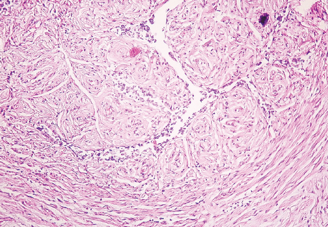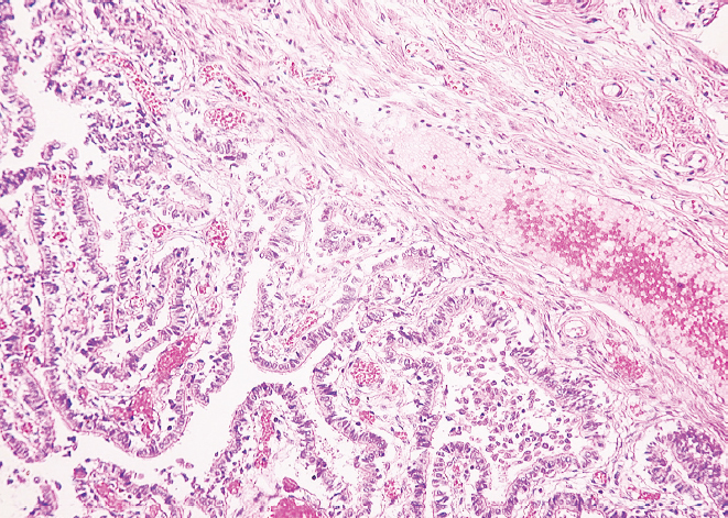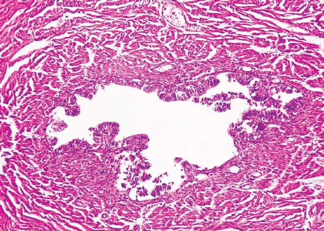 Рис. 4. Фрагмент воронки маточной трубы женщины в возрасте 86 лет. Окраска гематоксилином и эозином, увел. ×10