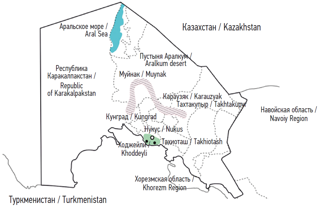 Рис. 2. Карта географического распределения населенных пунктов — мест проживания участников исследования из группы «Север» (заштрихованная область) и «Нукус» (сплошная заливка)