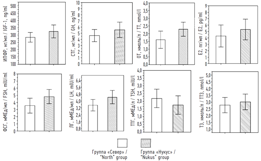 Результаты. Анализ данных выявил статистически значимо большие значения общего тестостерона, фолликулостимулирующего гормона и лютеинизирующего гормона у детей из группы «Нукус» по сравнению с их сверстниками из группы «Север». Концентрации инсулиноподобного фактора роста-1, соматоторопного гормона, эстрадиола, тиреотропного гормона и трийодтиронина в плазме крови у добровольцев из обеих групп статистически значимо не отличались.