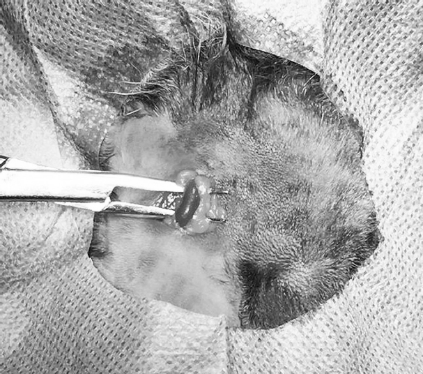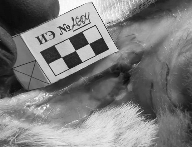 Под комбинированным наркозом выполнена венесекция поверхностной яремной вены 6 кроликам породы шиншилла. Выбор яремной вены для операции обусловлен размерами сосуда, соответствующими размерам подкожных вен человека. Доступ к вене осуществляли путем разреза кожи перпендикулярно ходу вены длиной около 2 см. Далее браншами зажима параллельно ходу вены раздвигали ткани и визуализировали ствол яремной вены (рис. 1).