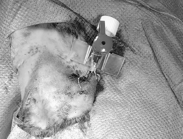 В пересечении вены не было необходимости, ее пункцию и катетеризацию выполняли под визуальным контролем. После успешной катетеризации вены операционную рану ушивали, катетер фиксировали к коже лигатурой (рис. 3).
