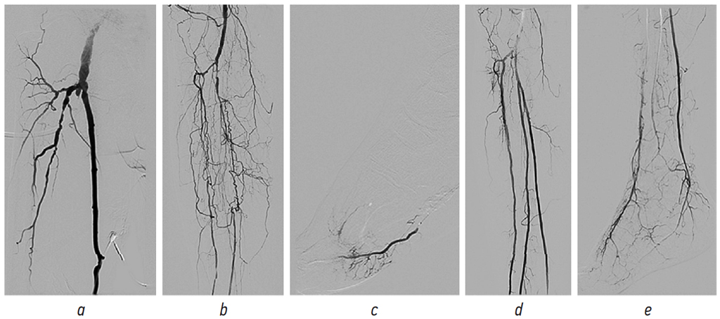 Рис. 1. Пример симультанного дистального гибридного вмешательства, выполненного пациенту 64 лет с критической ишемией нижних конечностей и глубокими трофическими изменениями в бассейне латеральной плантарной артерии: a — интродьюсер 6F установлен антеградно через боковую ветвь функционирующего бедренно-подколенного шунтирования; b — селективная прямая ангиография артерий подколенно-тибиального сегмента через интродьюсер: окклюзия всех трех артерий голени; с — этап реканализации задней большеберцовой артерии: инъекция контрастного вещества в латеральную плантарную артерию через просвет баллонного катетера; d — окончательный результат эндоваскулярного вмешательства: все три артерии голени функционируют; e — прямая ангиосомная реваскуляризация стопы