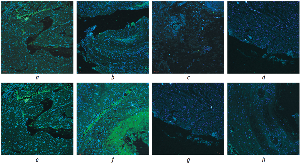 Рис. 2. Клинические примеры исследований экспрессии коллагенов в плаценте: a — экспрессия коллагена I типа в плаценте пациентки К. Н., 34 года, ИМТ 32; b — экспрессия коллагена I типа в плаценте пациентки А. П., 20 лет, ИМТ 21; c — экспрессия коллагена II типа в плаценте пациентки О. В., 31 год, ИМТ 34; d — экспрессия коллагена II типа в плаценте пациентки А. С., 32 года, ИМТ 23; e — экспрессия коллагена III типа в плаценте пациентки И. В., 30 лет, ИМТ 29; f — экспрессия коллагена III типа в плаценте пациентки В. П., 28 лет, ИМТ 24; g — экспрессия коллагена IV типа в плаценте пациентки О. В., 31 год, ИМТ 34; h — экспрессия коллагена IV типа в плаценте пациентки А. С., 32 года, ИМТ 23. Докрашивание ядер DAPI, увеличение ×20