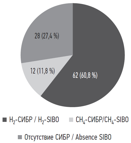 MATERIALS AND METHODS: The study included 102 patients (55 female and 47 male), median age: 10.0 [7.2–12.0], with functional dyspepsia (n = 32), functional constipation (n = 20), chronic diseases of the upper digestive tract (n = 13), atopic dermatitis (n = 21) and allergic diseases of the respiratory system (n = 16). All patients underwent gastroenterological and allergological examination including hydrogen breath test on the Lactophan apparatus and hydrogen-methane test on the GastroCheck Gastrolyzer apparatus to diagnose of hydrogenogenic (H2-SIBO) and methanogenic SIBO (CH4-SIBO).