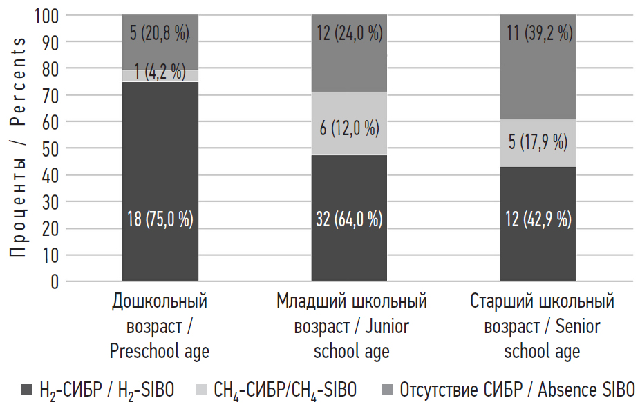 RESULTS: Inclusion of methane level in exhaled air into the diagnostic algorithm increased the frequency of SIBO diagnosis depending on pathology by 10–30%. In older age groups, there was a tendency to decrease the frequency of H2-SIBO, with a significant difference between preschool and high school age (18/75% and 12/42.9 %, p = 0.018), and a tendency to increase CH4-SIBO from 4.2 % to 17.9%. The frequency of H2-SIBO was significantly higher in children with functional versus chronic diseases of the upper digestive tract (22/71% и 4/30,8 %, p = 0,02). The highest frequency of SIBO was found in children with functional dyspepsia (89.8 %), functional constipation (87.9%) and atopic dermatitis (94.5%). CH4-SIBO was predominant in children with functional constipation (33%).