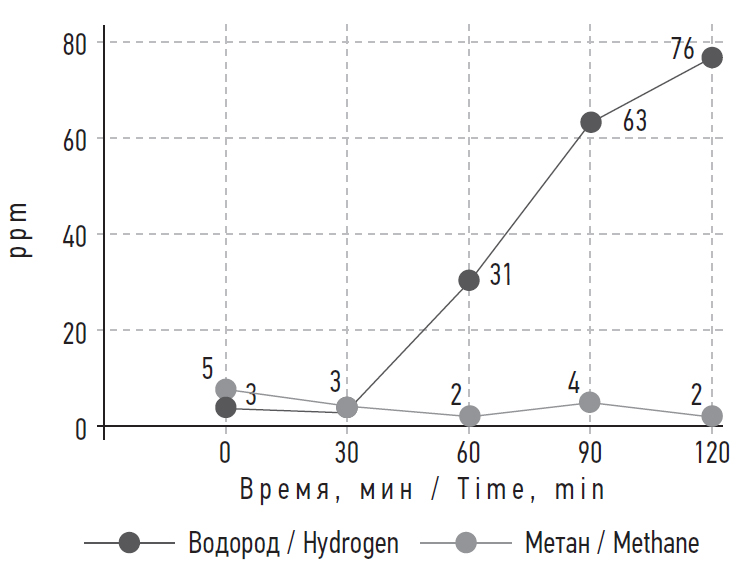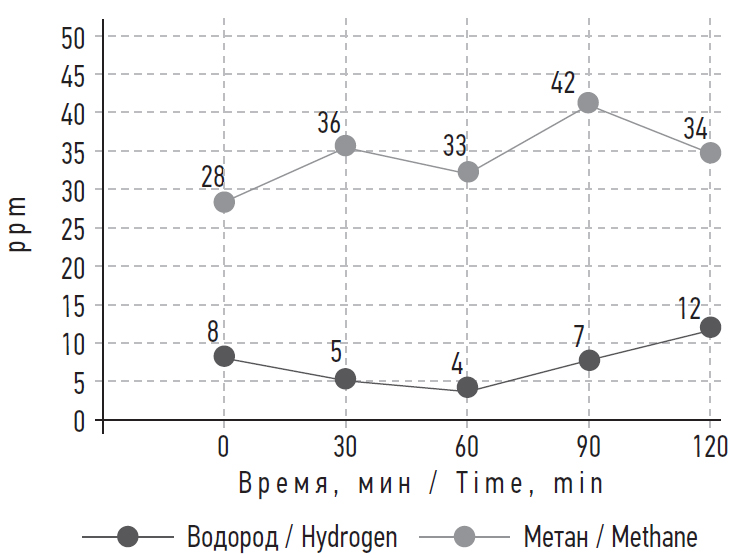 Всем пациентам для определения водородогенного и метаногенного вариантов течения СИБР проводили водородный дыхательный тест на аппарате «Лактофан» (ООО «АМА», Россия) и водородно-метановый тест на приборе GastroCheck Gastrolyzer (Bedfont Scientific Ltd., Великобритания). Водородно-метановые тесты выполняли с утра натощак с определением базального уровня водорода, метана и кислорода в выдыхаемом воздухе, а затем после приема лактулозы (из расчета 1 г/кг на прием, с добавлением 30–50 мл воды) каждые 30 мин в течение 2 ч. Необходимо отметить, что клетки организма человека не способны синтезировать основные газовые метаболиты — водород и метан, которые являются продуктами жизнедеятельности только микробиоты. Положительным считался дыхательный тест при увеличении уровня водорода в выдыхаемом воздухе на 60–90 мин на 20 ppm по сравнению с базальными цифрами и увеличение уровня метана на 10 ppm в любое время в сравнении с базальными цифрами до 90 мин исследования (ESPGHAN, 2022).