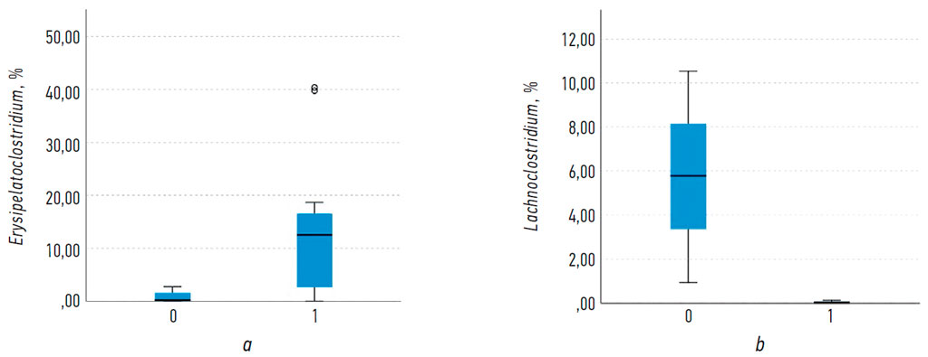 Рис. 1. Диаграмма размаха долей бактерий рода Erysipelatoclostridium ( а ) и Lachnoclostridium ( b ) в составе микробиоты кишечника девочек (0) и мальчиков (1). Жирная линия внутри обозначает медиану каждой группы, нижняя и верхняя часть прямоугольника — 25-й и 75-й процентили соответственно, «усы» — минимальное и максимальное значение, не являющееся экстремальным