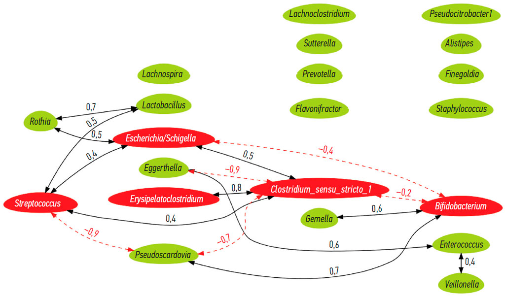 Рис. 2. Коррелограмма связей между родами бактерий, выделенных в результате секвенирования 16S рРНК, в микробиоме кишечника в 1-й группе (у девочек). Красным цветом показаны доминирующие в составе микробиома кишечника роды бактерий по их доле у девочек. Черные сплошные стрелки — положительные корреляции, цифра над стрелкой — сила корреляции